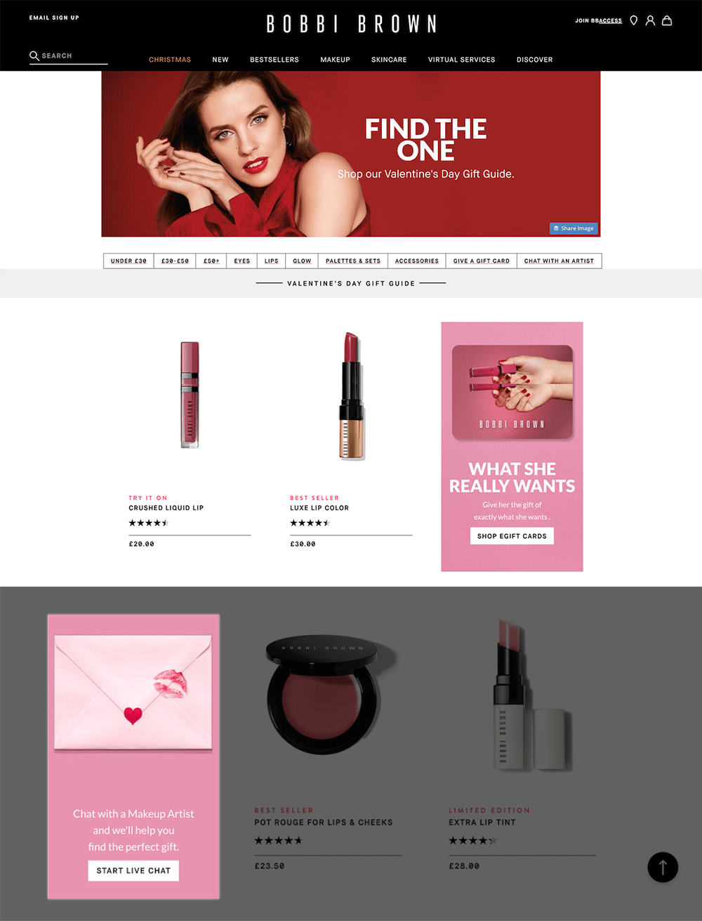 Bobbi Brown 的情人節禮卡置入與真人專家諮詢 (圖: Bobbi Brown)此外,Bobbi Brown 還利用彈出視窗和嵌入式CTA進一步引導用戶至專屬優惠頁面。從數據應用角度看,通過監測造訪、點擊率和轉換數據,品牌可以精準判斷哪些產品、促銷方式以及版位更受歡迎,並根據用戶行為進行A/B Test分析與即時調整,使得整個購買流程更加順暢和個性化。