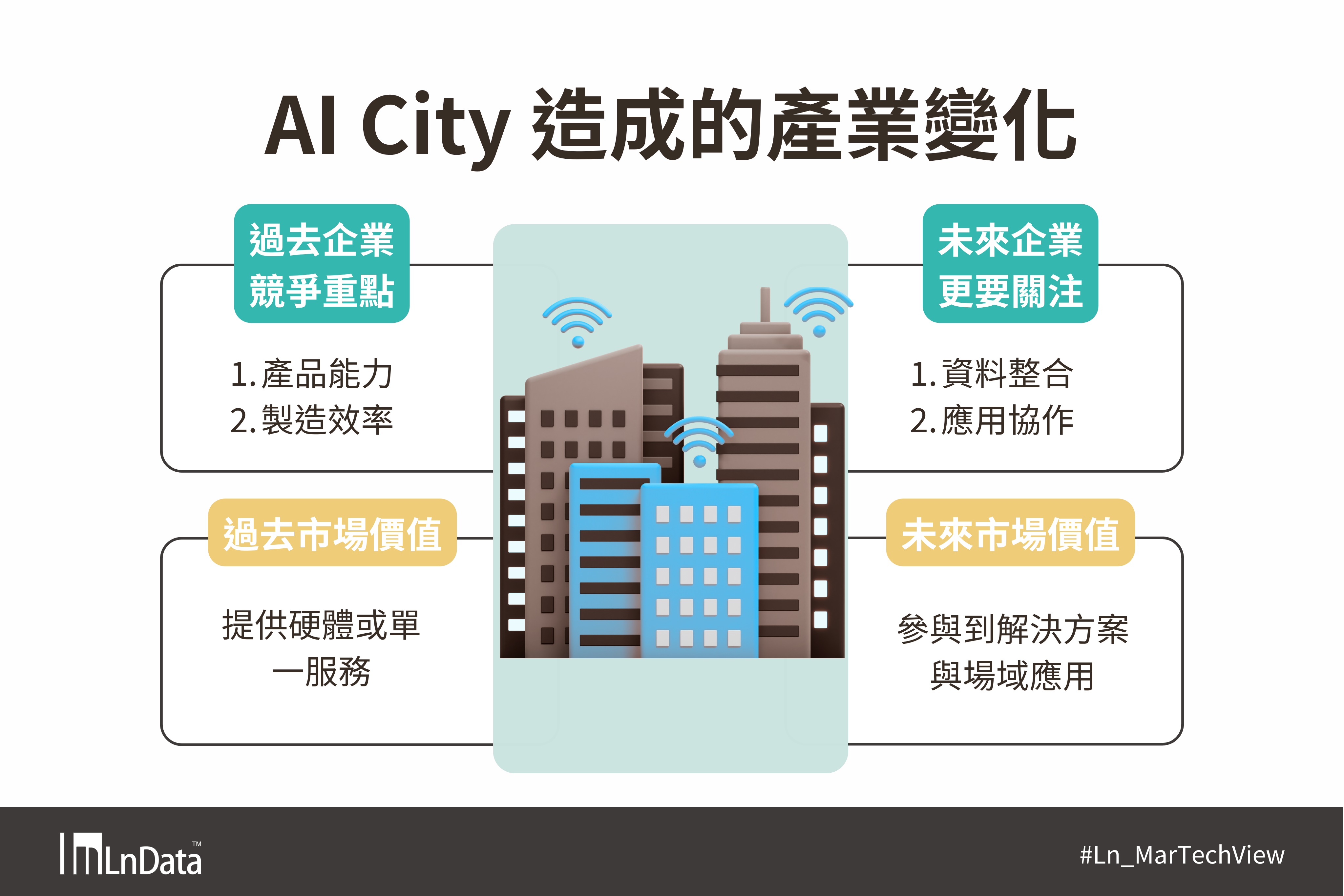 在 AI City 帶來的城市能力升級過程中,產業競爭的核心正在改變。過去幾十年,企業的競爭力主要建立在產品本身的品質與製造效率;而在 AI 城市治理發展下的時代,光有好產品還不夠,企業還需要具備資料整合、跨系統協作與快速應變的能力。具體來看,產業結構出現兩個明顯轉變: