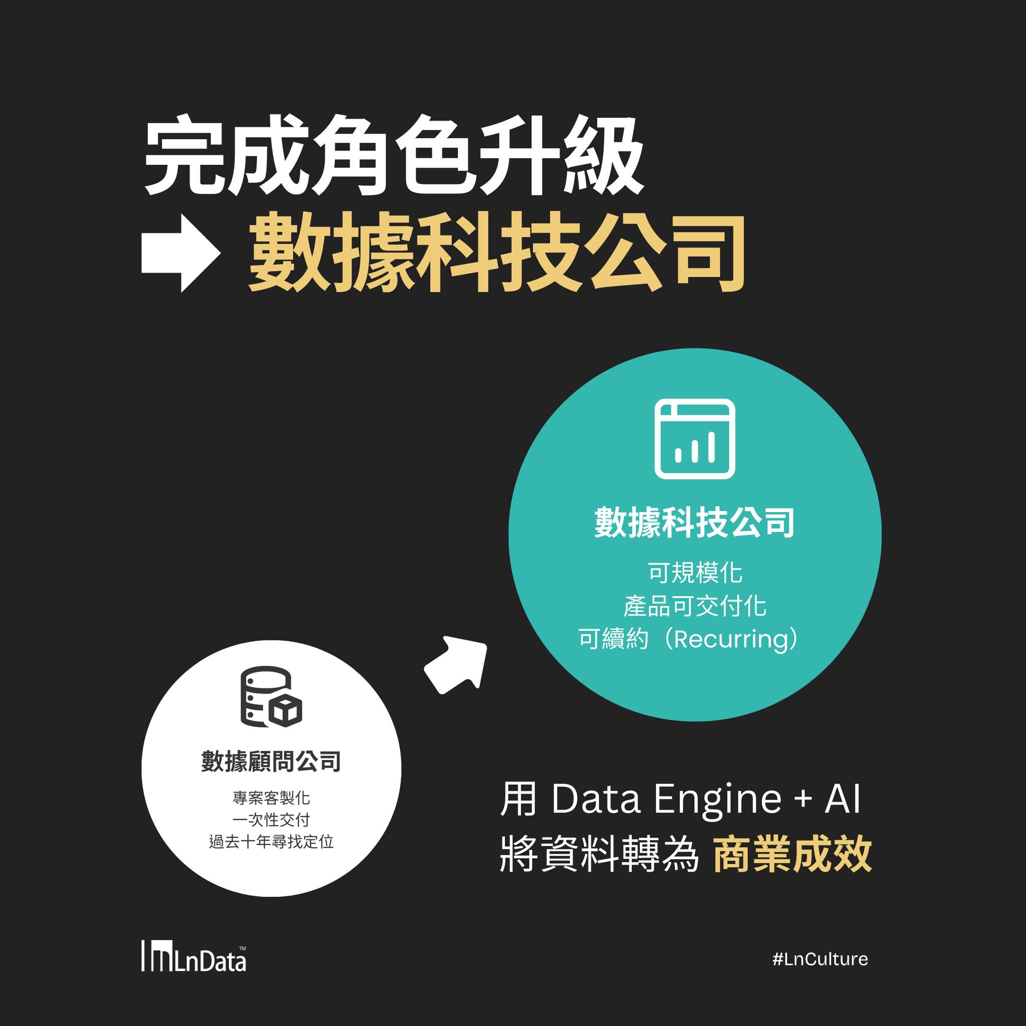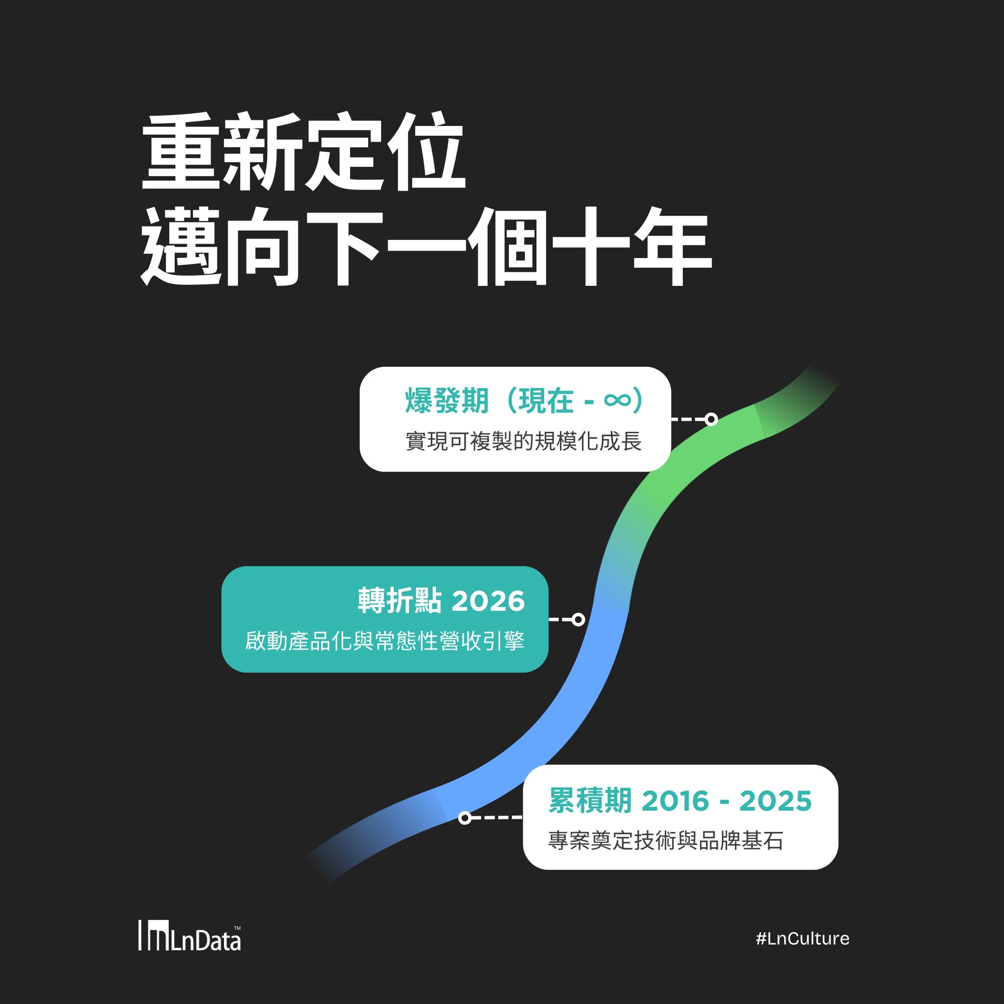 2026 年,正逢 LnData 成立十週年,我們正式啟動全面轉型,從過去的數據顧問與專案服務模式,升級為具備產品規模化與交付化能力的 數據科技公司 ( Data Technology Company ),並以 AI 與數據治理為核心,展開下一個十年的成長旅程。
